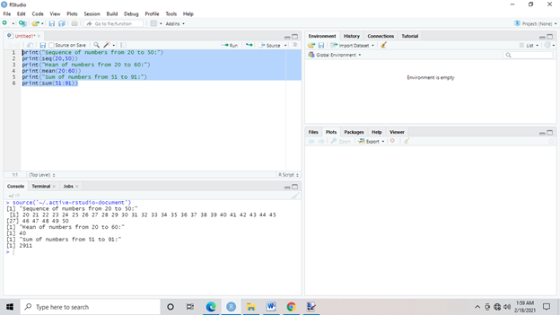1. Write a R program to create a sequence of numbers from 20 to 50 and find the mean of numbers from 20 to 60 and sum of numbers from 51 to 91.